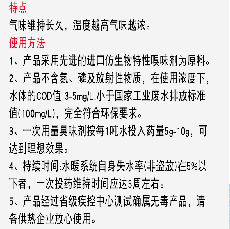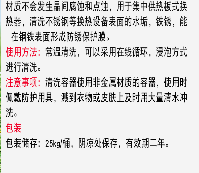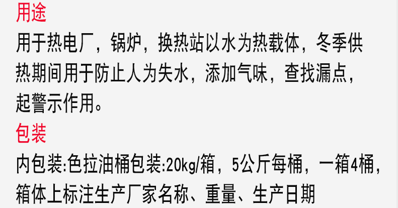 用途 用于热电厂,锅炉,换热站以水为热载体,冬季供热期间用于防止人为失水,添加反光剂,光线折射便于查找漏点,起警示作用。 包装 包装:1-5kg/袋*,20kg/桶,桶体合格证上标注生产厂家名称、重量、生产日期,保质期