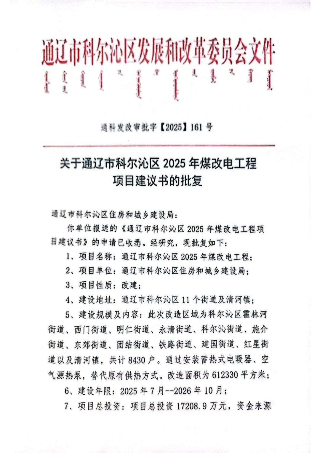 关于通辽市科尔沁区2025年煤改电工程项目建议书的批复