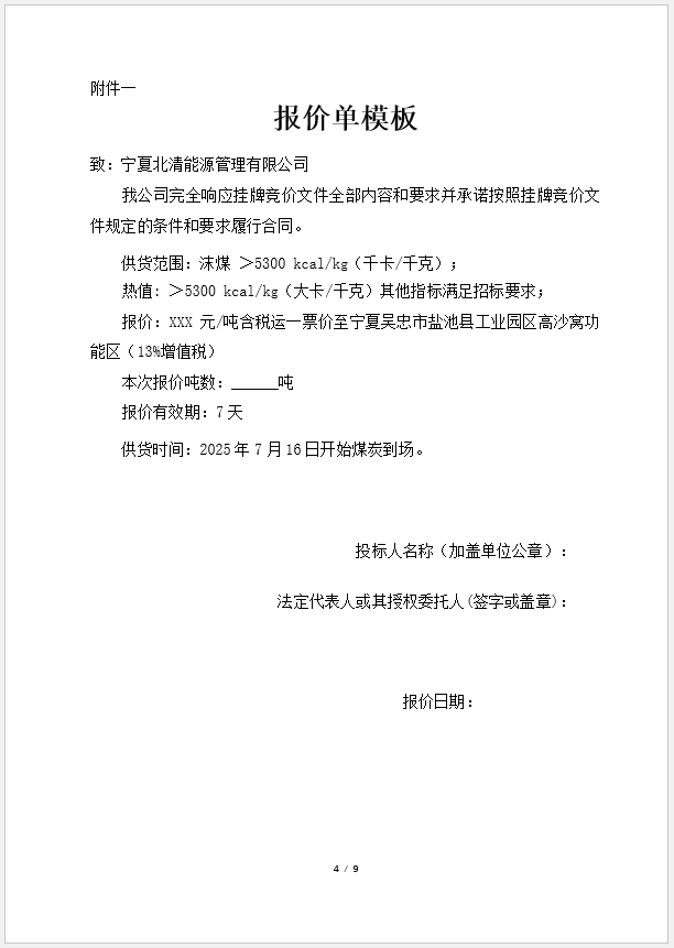 邮件主题要求:宁夏北清挂牌竞价-煤炭报价单-XXXX公司