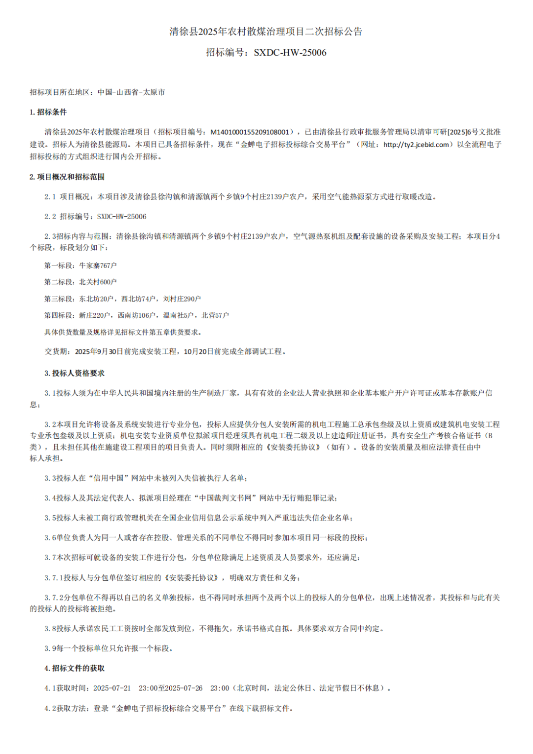 清徐县2025年农村散煤治理项目二次招标公告