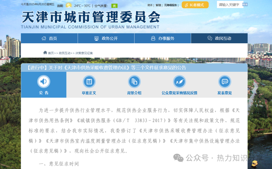 为进一步提升供热行业管理水平,规范供热企业服务行为,切实保障人民权益,近日,天津市城事管理委员会根据《天津市供热用热条例》《城镇供热服务(GB/T 33833-2017)》等有关法规和政策文件、规范标准的要求,结合我市实际情况,修订了《天津市供热采暖收费管理办法(征求意见稿)》《天津市供热室内温度测量管理办法(征求意见稿)》《天津市集中供热设施管理办法(征求意见稿)》,现向社会公开征求意见。