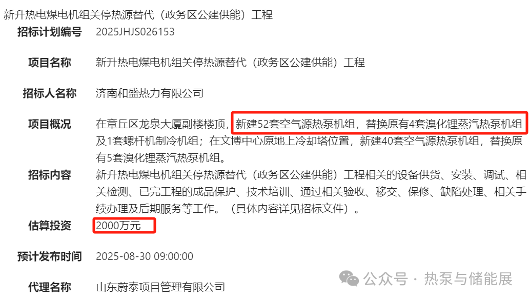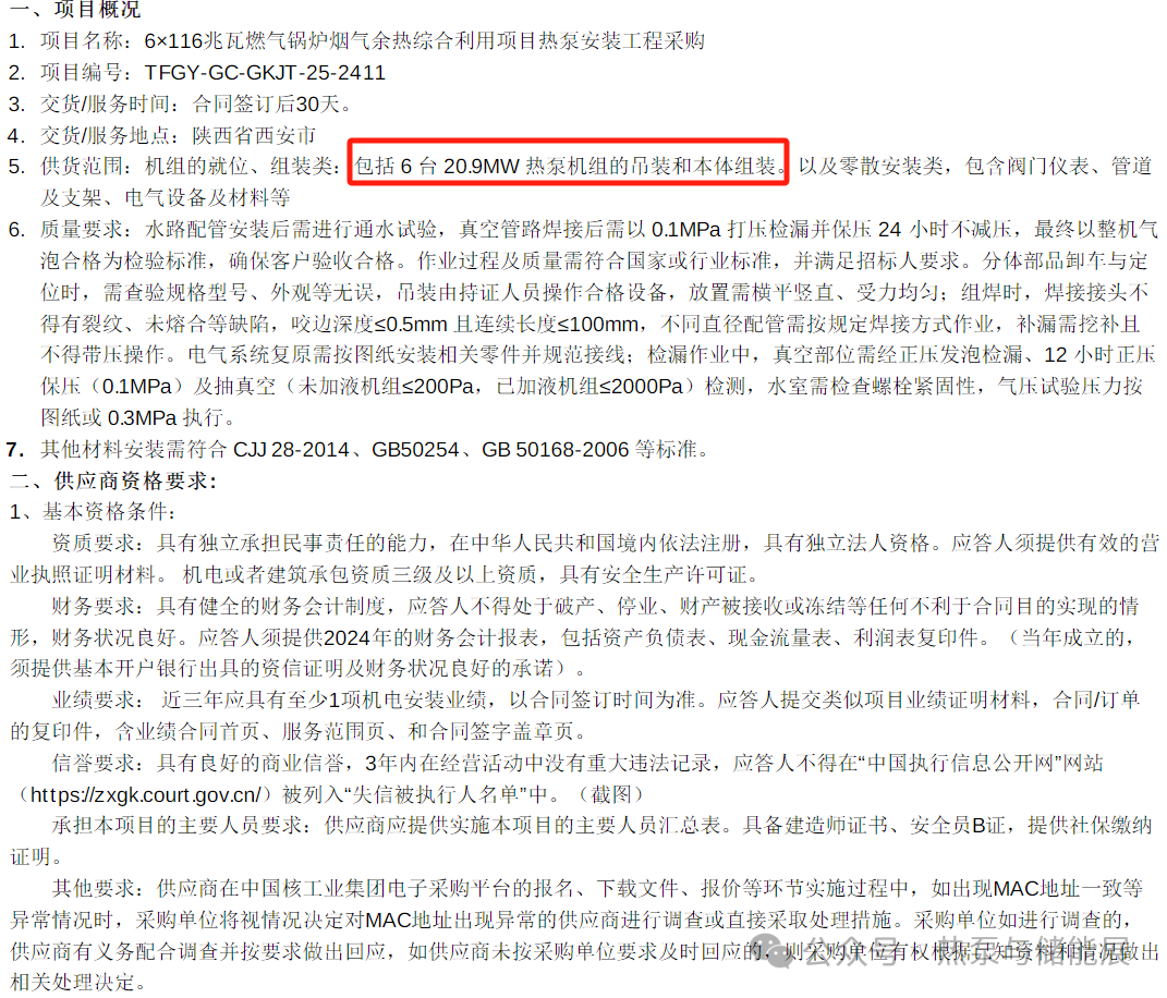 (2)内容:主要包括热泵系统、控制及仪表系统、配套设备设施、高压配电室、设备电气及相关附属设施和配套土建施工等。