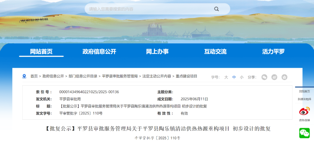 【批复公示】平罗县审批服务管理局关于平罗县陶乐镇清洁供热热源重构项目初步设计的批复