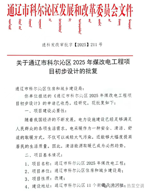 通辽市 采用空气源热泵、蓄热式电暖器!科尔沁2025年煤改电工程项目获批复