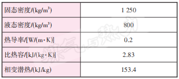实验以水作为换热流体。为了减少相变换热单元热量损失,在相变换热单元外部包裹2层30 mm厚的橡塑珍珠棉,并在珍珠棉外侧包裹20 mm厚的保温塑料板。选取64#石蜡作为相变材料,熔化开始温度为60 ℃,熔化终止温度为64 ℃。1个相变换热单元装入1.333 kg的固态相变材料,相变材料的热物性参数见表1。