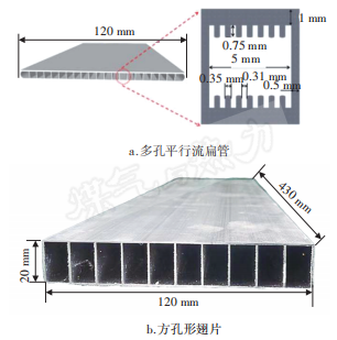 多孔平行流扁管的长×宽×厚为600 mm×120 mm×7 mm。在扁管上下区各留85 mm的长度用于稳定换热流体的流动。多孔平行流扁管包含21个独立通道,每个通道内部均有微小翅片。方孔形翅片利用导热硅胶贴在多孔平行流扁管两侧。
