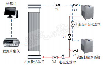 实验系统见图3。实验对象为1个相变换热单元,图3仅给出了换热流体下进上出的工况。实验系统主要由相变换热单元、换热流体循环系统、数据采集系统3部分组成。相变换热单元:在多孔平行流扁管的通道口焊接铝管,形成换热流体进出总管。换热流体循环系统:主要包括恒温水浴箱(提供温度相对稳定的热水)、电磁流量计、截止阀(V1~V6)。数据采集系统:负责采集恒温水浴箱温度、换热流体质量流量、相变换热单元内部温度、相变换热单元进出水温度。每隔10 s采集1次数据。