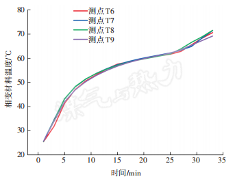 蓄热实验相变换热单元初始温度及进水温度不变,换热流体质量流量为1.5 kg/min,进出水方式为下进上出。由于测点T5位于相变换热单元最上端,有因相变材料填充不足导致测点不能反映相变材料温度的风险,因此在统计数据时将测点T5的测量结果剔除。