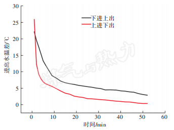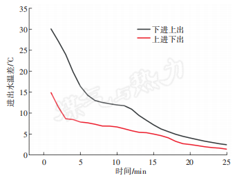 图6 取热实验换热流体分别采取上进下出、下进上出时进出水温差随时间的变化