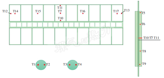 相变换热单元内部温度测点布置见图4。其中,测点T5~T9用于测量相变换热单元高度方向相变材料温度,测点T7近似位于高度中点。测点T10~T16与测点T7同高度,测点T7、T10、T11用于测量相变换热单元厚度方向相变材料温度,测点T7、T12~T17用于测量相变换热单元宽度方向相变材料温度。测点T1、T2布置在进水管入口,T3、T4布置在出水管的入口,分别测量相变换热单元进出口换热流体温度。