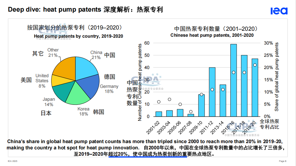 全球的热泵专利数量是衡量热泵技术创新的一项指标,自2000年以来,中国在全球热泵专利数量中的占比增长了三倍多,到2019-2020年间,占比已超过20%,这使中国成为热泵创新的重要热点地区。更多的技术创新带来更多的收益,目前研究的重点主要集中在以下几个方面:智能与灵活性、降噪、更高的效率、更紧凑的设计等。近年来,中国在热泵技术专利注册国家中一直位居首位,反映出中国作为热泵主要制造国的重要地位。
