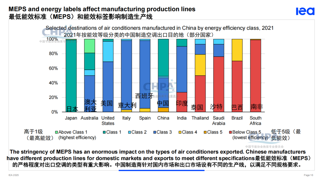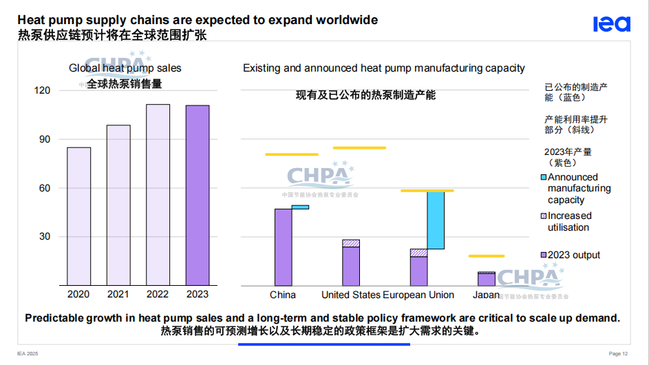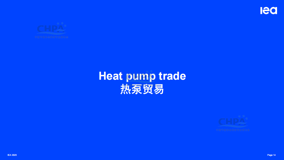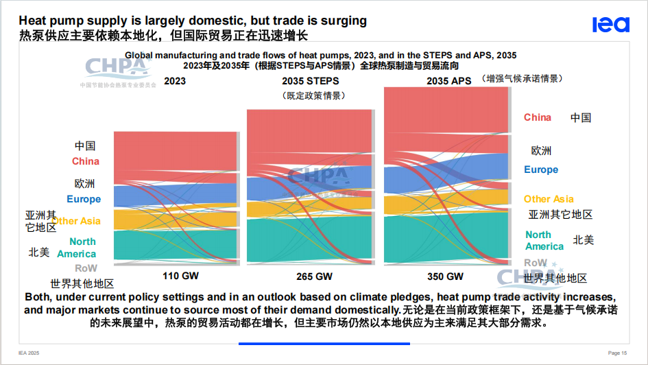 上图体现的是热泵在2023年的贸易数据,全球热泵的贸易量仅占装机量的1/4左右,主要原因是热泵市场以本地供应为主来满足大部分需求。中国是最大的热泵出口国,2023年出口量超过10GW,出口量占中国热泵产量的25%,占全球贸易量的一半,其中,75%出口到欧洲国家。未来,无论是在当前的政策框架下,还是基于气候承诺的未来展望中,热泵的贸易都会增长,但主要市场仍然以本地供应为主来满足其大部分需求。