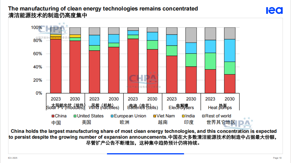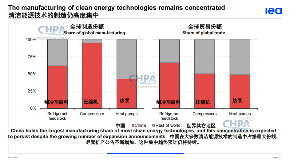 接下来我们看热泵供应链,首先,清洁能源技术的制造仍是高度集中的趋势,中国在大多数清洁能源技术的制造中占据最大份额。对于热泵而言,供应链是相对多元化的,这是因为热泵是差异化的产品,各个地区的标准、消费者偏好等都是不同的,所以大多数的热泵供应都是以本地生产为主。