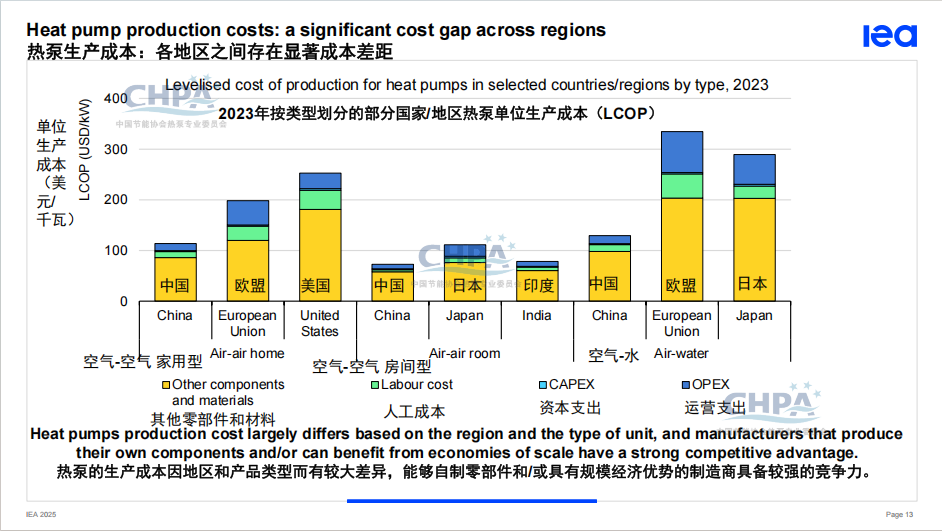 另外一个可以帮助我们理解供应链发展趋势的方式就是看热泵生产成本,由于各地热泵行业的标准不同,所以很难进行比较,但是总体来看,中国热泵产品的制造成本比美国要低50%左右,比欧盟要低40%-60%。总而言之,热泵的生产成本因地区和产品类型而有较大差异,能够自制零部件和具有规模经济优势的制造商具备较强的竞争力。