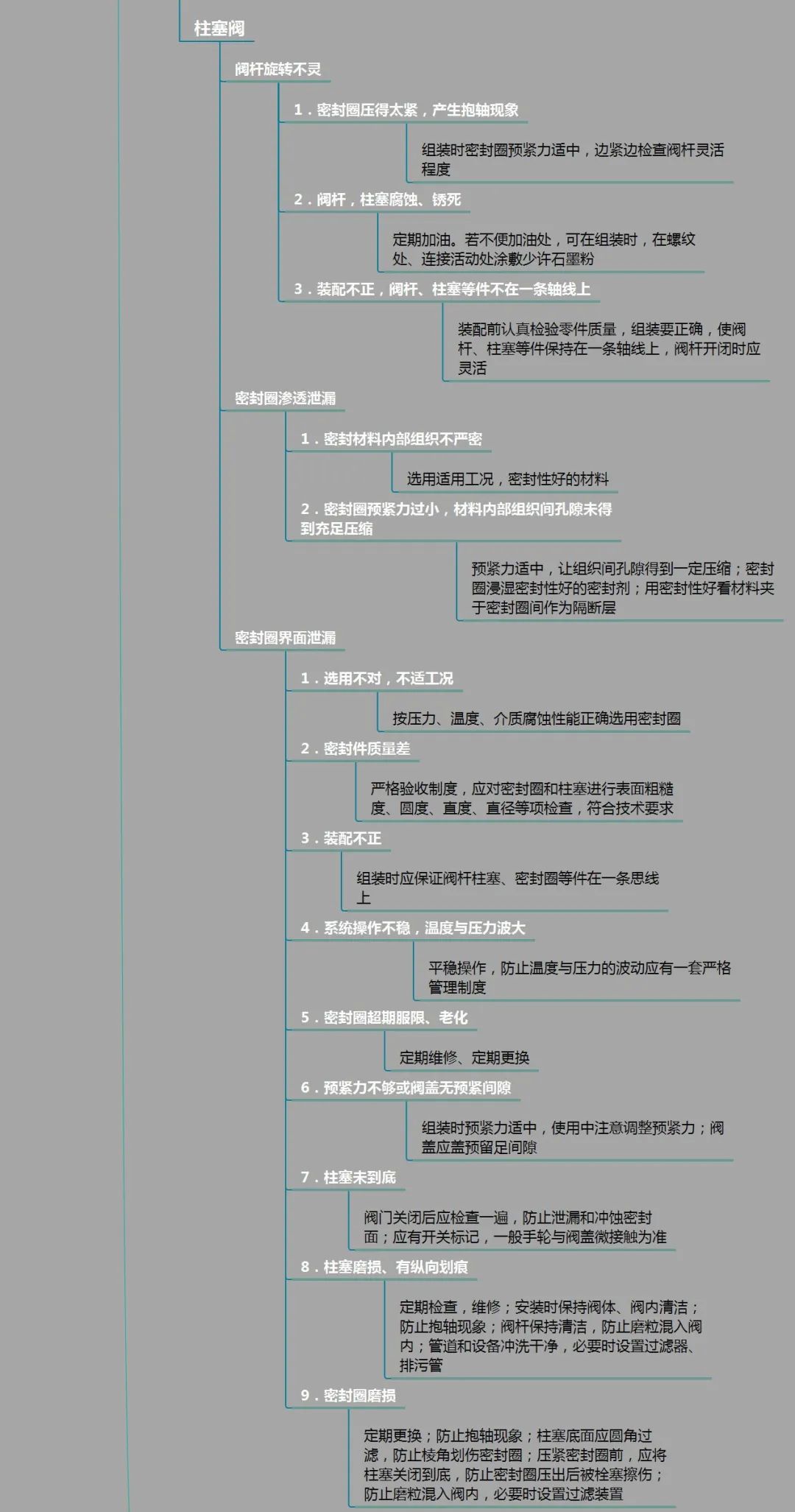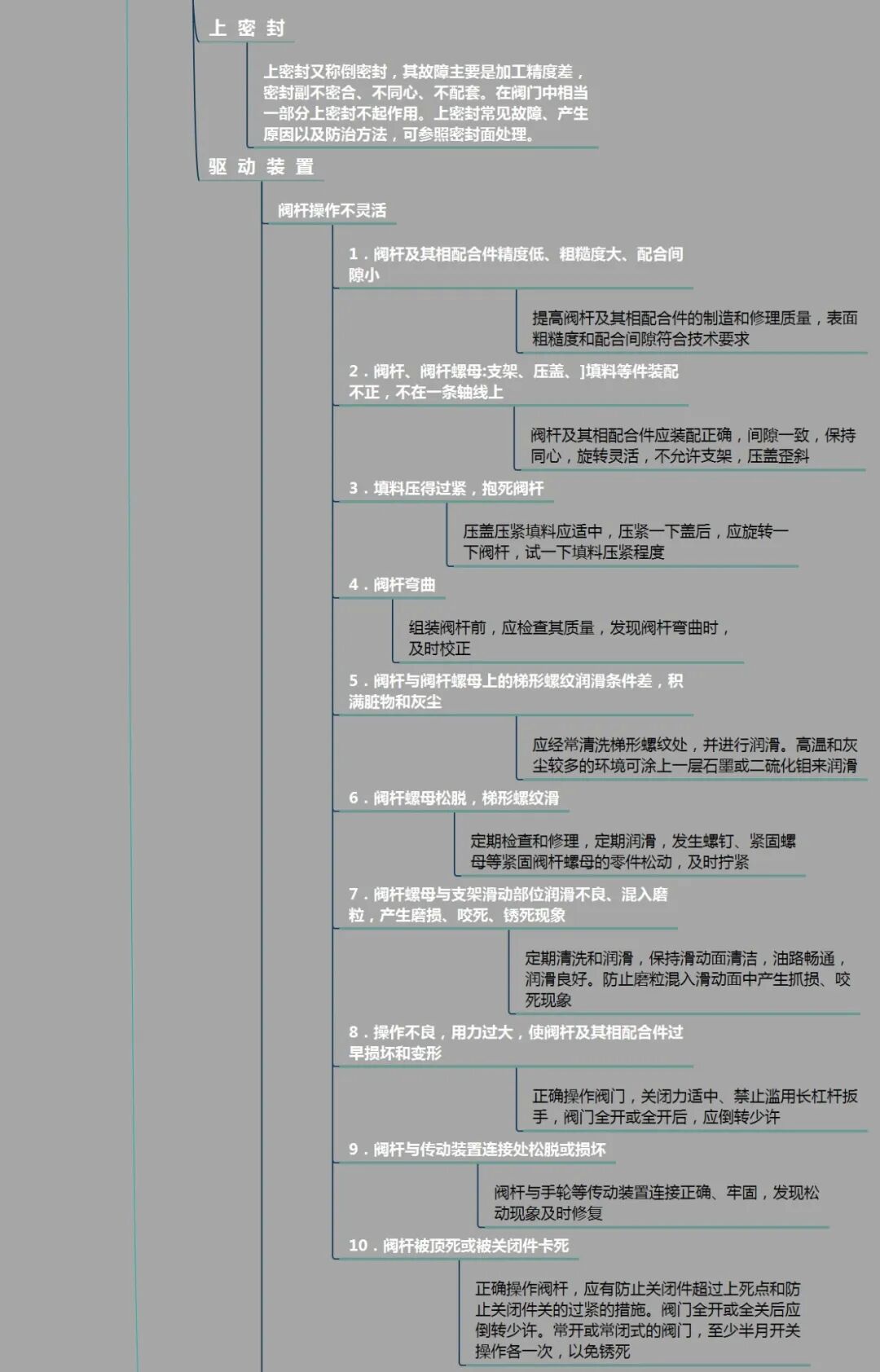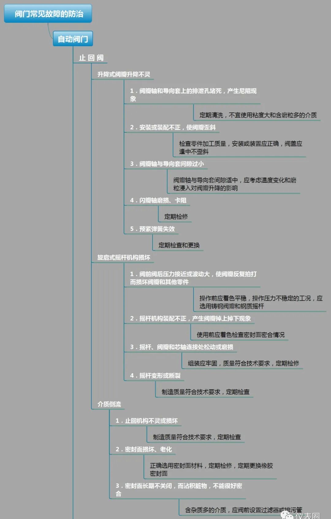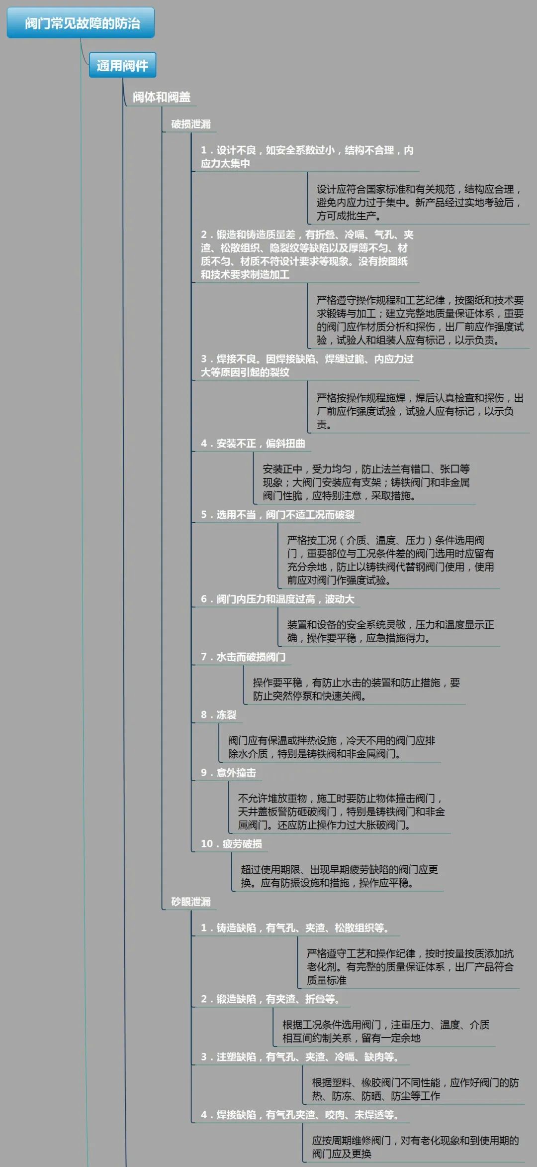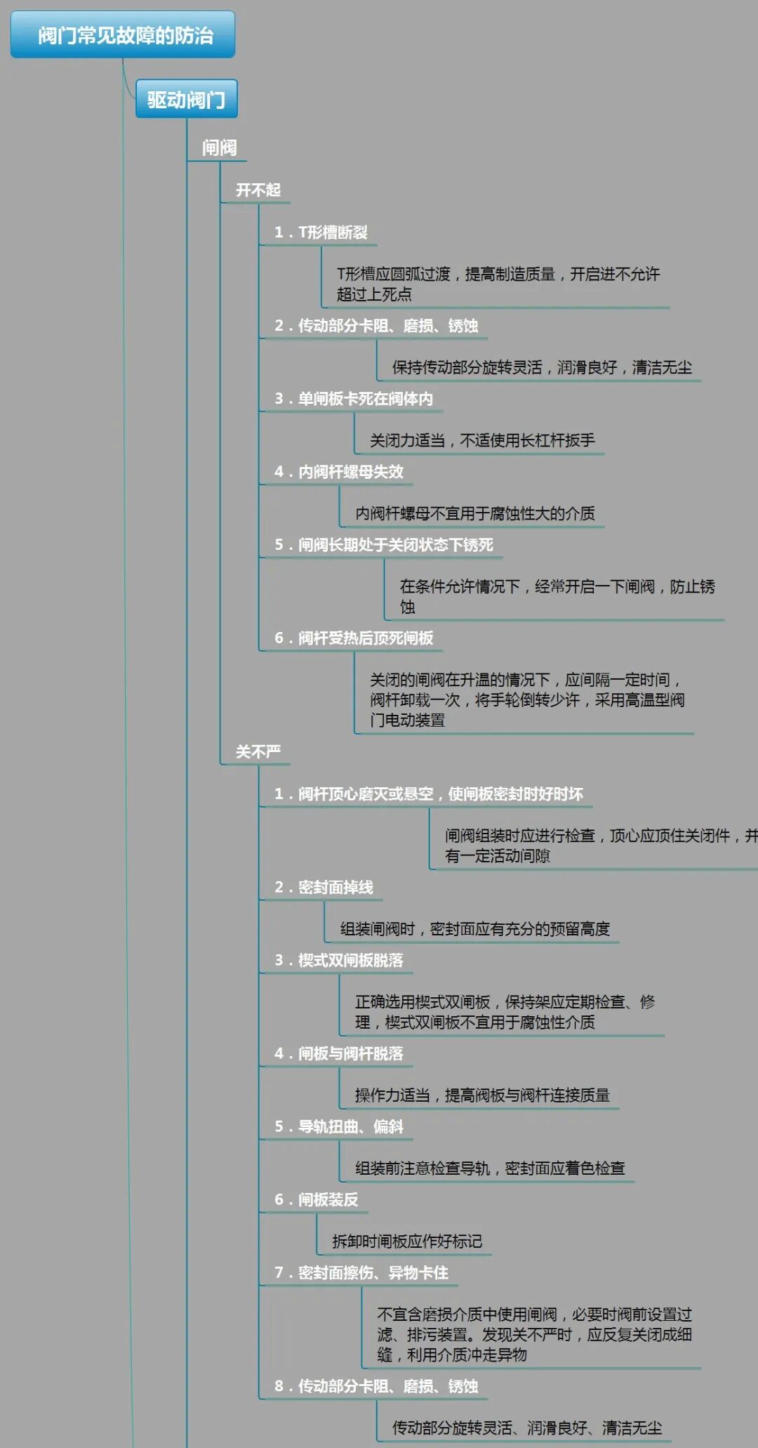 阀门在使用过程中,会出现各式各样的故障。一般来说,一是与组成阀门零件多寡有关,零件多常见故障多;二是与阀门的设计、制造、安装、工况、操作、维修优劣有着密切关系。各个环节的工作搞好了,阀门故障就会大大减少。本文汇总了通用阀件、驱动阀门、自动阀门的常见故障原因及预防措施,帮助大家加强对阀门的维护。