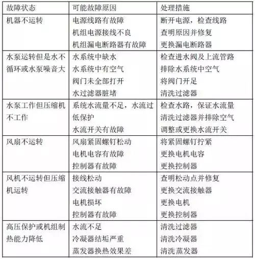在使用过程中如发现有故障,应立即切断电源,请与专业维修人员联系,维修人员在处理问题时,可参照下表排除故障。空气源热泵冷暖机组是自动化程度较高的设备,使用时定期进行机组状态检查,若能对机组进行长期而有效的维护和保养,机组的运行可靠性和使用寿命都会得到有效的提高。1.机外安装的水过滤器应定期清洗,保证系统内水质清洁,以免机组因水过滤器脏堵而造成损坏;2.用户在使用和维护本机时应注意:机组内所有的安全保护装置均在出厂前设定完毕,切勿自行调整;3.经常检查机组的电源和电气系统的接线是否牢固,电气元件是否动作异常,如有应及时维修和更换;4.经常检查水系统的补水、安全阀、排气装置工作是否正常,以免空气进入系统造成水循环量减少,从而影响机组的制热量和机组运行的可靠性;5.检查水泵、水路阀门是否正常工作,水管及水管接头是否渗漏;6.机组周围请勿堆放杂物,以免堵塞进出风口,机组周围保持清洁干燥,通风良好。定期清洗(1-2 月)空气侧换热器,以保持良好的换热效果;7.经常检查机组各个部件的工作情况,检查机内管路接头和阀门处是否有油污,确保机组制冷剂无泄漏;8.若停机时间较长,应将机组管路中的水放掉,并切断电源,套好防护罩。再运行时,开机前系统进行全面检查;9.机组出现故障,用户无法解决时,请告电本公司在当地的特约维修部,以便及时使派人维修;10.主机冷凝器清洗,建议采用20-30℃、浓度为5%的柠檬酸液清洗冷凝器,启动循环水泵清洗2 小时,最后用自来水冲洗3遍;禁止用腐蚀性的清洗液清洗冷凝器。