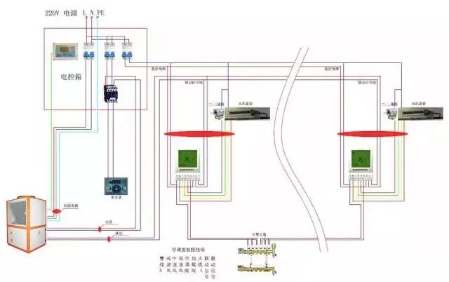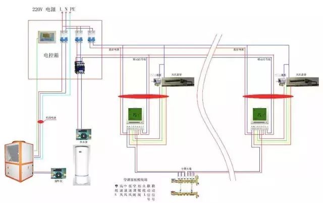 冷凝水管尽量布置在靠近排放的地点,减少凝水管长度;冷凝水管应就近排放,如果就近排放点多,条件允许,均可就近排放;冷凝水管路注意泄水坡度,尽量保证在 0.003~0.005;冷凝水管路找坡困难者,可以水平铺设,但管径放大一号。注:机组电气联接,请查看各厂商产品气操作手册,具体产品电气连接本次略。警示:进行电气系统联接前,应先关闭电源并接妥地线,并由具备专业资质的人员进行操作!机组的主电源应在以下范围内:单相电:220V±10%内。三相电:380V±10%内。机组的接地螺栓必须与电源的接地线紧密连接,接地电阻≤4 欧姆。备注:因主板输出的水泵继电器为220V、5A,因此安装三相水泵或大于500W 的单相水泵需加交流接触器。备注:因主板输出的电加热继电器为220V、5A,因此安装辅电加热时需加交流备注:机组必须安装水流开关,不能短接水流开关,否则会造成机组损坏。备注:室内温控器的联动信号连接到主机的联动信号端,保证主机和室内机联动启停,如无联动信号,需短接端子上的联动信号端。