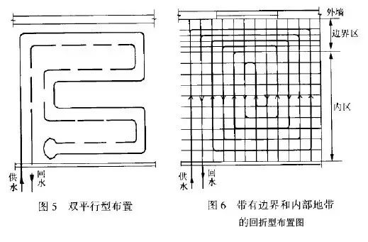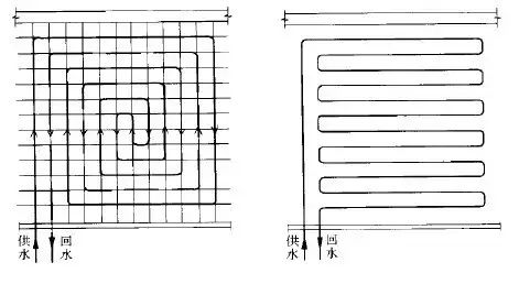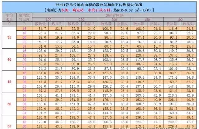 Rn —— 体积热指标 根据建筑的保温情况宜取0.4-0.7地暖面盘管的管间距直接影响到地板的散热量,而地板散热量需满足室内负荷的要求。管间距根据管材、室内设计温度、供水温度、地板材料等因素而定。下表是PE-RT管材,地面材料为水泥地砖,在不同水温、室内温度和管间距的条件下的地面散热量(其他地面材料的散热量数据见附录1)根据建筑物的负荷指标和相应建筑面积的乘积,得出建筑的负荷。机组总负荷的确定:建筑的负荷或空调总负荷×80%左右的同时使用率。公寓房可不考虑同时使用率。特殊情况需根据建筑功能和使用情况确定。大、中型工程应选二台以上,但不宜过多,并考虑备用机组的可能性。若建筑物的最大负荷与最小负荷的差距过大,宜大、小容量机组搭配工作。1) 热泵主机的安装与空调室外机的安装要求相似。可安装在屋顶、阳台、地面上。出风口应避开迎风方向。2) 主机(侧出风)与四周墙壁或其他遮挡物之间的距离不能太小,出风口1米内不应有遮挡物,保证主机换热器的吸热散热不受阻碍。3) 主机(顶出风)进风口1米内不能有遮挡物,出风口2米内不应有障碍物,保证主机换热器的吸热散热不受阻碍。当机组安装在屋檐下或机组上方有水平障碍物时,机组的安装位置必须在通风良好的地方,否则容易发生气流短路,造成机组散热能力差。1) 开式循环系统:管路中的循环水与大气相通的系统。循环水水与大气接触,易腐蚀管路;用户与机房高差较大时,水泵则需克服高差造成的静水压力,耗电量大。2) 闭式循环系统:管路系统不与大气接触,在系统最高点设有排气阀的系统。管道与设备不易腐蚀;不需克服高度差,从而循环水泵功率小。3) 同程式系统:并联环路中的各支路的流程都是相等的系统。◆优点:系统的水力稳定性好,各设备间的水量分配均衡。◆缺点:由于采用回程管,管道的长度增加,水阻力增大,使水泵的能耗增加,并且增加了初投资。4) 异程式系统:并联环路中的各支路流程不等的系统◆缺点:各并联环路管路长度不等,阻力不等,流量分配难以平衡。5) 定水量系统:系统中循环水量为定值,或夏季和冬季分别采用不同的定水量,负荷变化时,改变供、回水温度以改变制冷量或制热量的系统。特点:定水量系统简单,操作方便,不需要复杂的自控设备和变水量定压控制。6) 变水量系统,一般适用于间歇性降温的系统(影院、剧场、大会议厅等):保持供水温度在一定范围内,当负荷变化时,改变供水量的系统。特点:变水量系统的水泵的能耗随负荷较少而降低,在配管设计时可考虑同时使用系数,管径可相应减少,降低水泵和管道系统的初投资;但是需要采用供、回水压差进行流量控制,自控系统比较复杂。