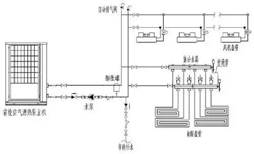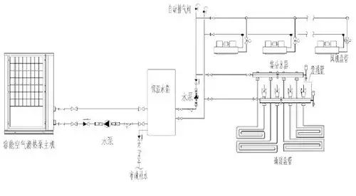 按照逆卡诺循环原理,该系统主要空气源热泵主机和末端两大部分组成。空气源热泵机组与末端共同使用,前者提供冷水或热水,后者将冷水或热水,通过热交换,提供冷气或采暖。空气源热泵机组是采暖系统中的主机,由于采用空气源冷凝器不需要冷却塔;而蒸发器是水冷的,夏天制冷时提供冷水,冬季制热时提供热水,风机盘管是空调系统的末端装置,装在室内如同把水从低处提升到高处而采用水泵那样,采用热泵可以把热量从低温抽吸到高温。所以热泵实质上是一种热量提升装置,热泵的作用是从周围环境中吸取热量,并把它传递给被加热的对象(温度较高的物体)。