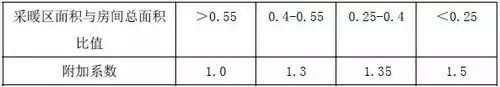 冬季采暖通风系统的热负荷,应根据建筑物下列散失和获得的热量确定:1)围护结构的耗热量,包括基本耗热量和附加耗热量,3)加热由门、孔沿及相邻房间浸入的冷空气的耗热量;对于一般民用住宅层高在3m 以下工程上可采用面积热负荷法进行概算。qn —— 建筑物的采暖单位面积热负荷,W/m2,建筑各个区域的围护结构、冷空气渗透情况均有差别,如果需要计算的较为准确,应根据各个区域在建筑中的位置(如:是否靠近外墙、外墙上的门窗)和门窗(是否有冷空气渗透)进行分别计算。普通卫生间根据面积提供500~1000W的定值来计算。附加系数为采暖面积与全房间面积的比值,根据下表进行选择:上表的附加系数为标准推荐数值,在实际工程中应根据实际情况做出具体调整。房间进深大于6 米时,以距外墙6 米为界分区当作不同的单独房间,分别计算供暖热负荷。