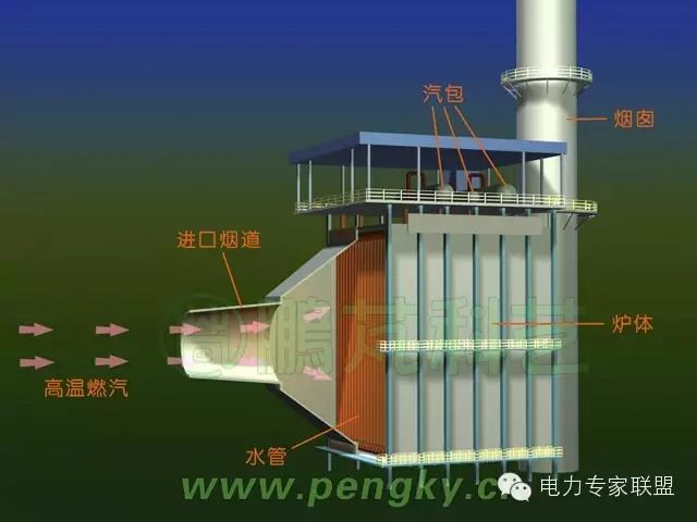 从燃气轮机排出的气体温度高达摄氏600度,仍然具备很高的能量,用这些气体的热量来产生蒸汽的锅炉称为余热锅炉。