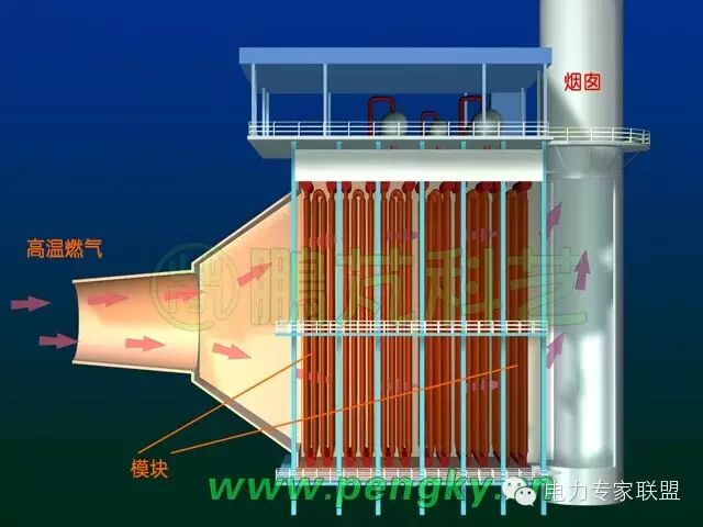 从外观上看锅炉主要有进口烟道、炉体、汽包、烟囱组成。炉体内有密集的管道,给水泵将要加热的水压进这些管道,燃气轮机排出的高温气体将管道内的水加热成高压蒸汽,下面就是余热锅炉的外观图(进口烟道为剖面)。