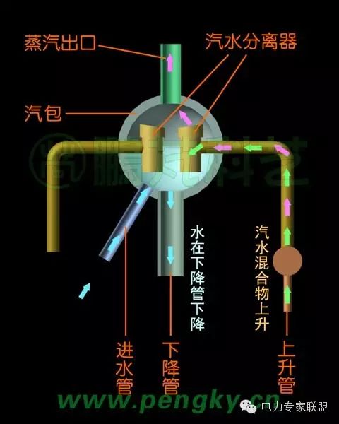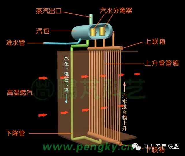 把水注入汽包,水便灌满上升管管簇与下降管,把水位控制在靠近汽包中部的位置。当高温燃气通过管簇外部时,管簇内的水被加热成汽水混合物。由于下降管中的 水未受到加热,管簇内的汽水混合物密度比下降管中的水小,在下联箱形成压力差,推动上升管内的汽水混合物进入汽包,下降管中的水进入上升管,形成自然循环。