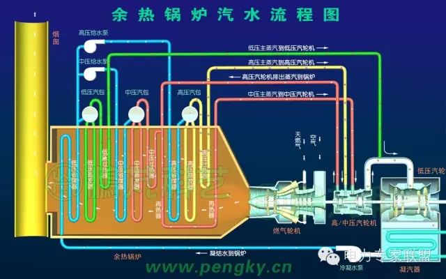 从燃气轮机排出的气体温度高达摄氏600度,仍然具备很高的能量,把这些高温气体送到锅炉,把水加热成蒸汽去推动蒸汽轮机,带动发电机发电,可使发电容量与联合循环机组的热效率相对增高50%左右。这个靠燃气轮机排出气体的余热来产生蒸汽的锅炉称为余热锅炉。