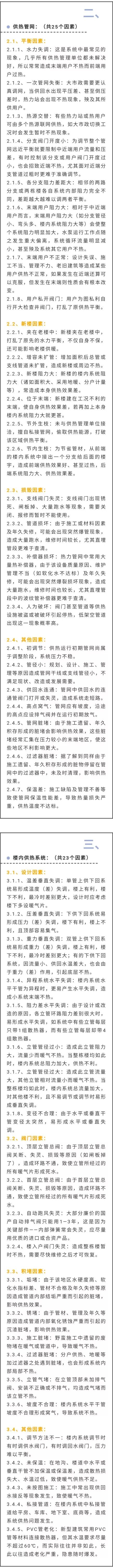 1.补水因素: 1.1.1定压点低:补水泵定压点低,系统中高大建筑不热。 1.2.1、循环泵故障:循环泵出问题,无备用泵,系统不循环。 1.3.1、供热锅炉容量小:现有锅炉供热量满足不了用户实际需求。 1.4.1、换热器选型小:当需要热力站进行二次换热时,现有换热器换热量满足不了用户实际需求。 1.5.1、非专业司炉工:供热管理单位的司炉工无证上岗,这在某些地区具有一定普遍性,甚至这些地区的某些管理单位还是匆忙接手的外行。 1.6、其他因素: 1.6.1、停电:补水泵、循环泵不能启动。 4 供热用户:(共24个因素) 4.1、私改因素: 4.1.1、新暖气片超大:用户私改暖气时,选用超长的暖气片或过多的暖气片数,会造成供热入户阻力加大,在单管串系统中会使楼上和楼下用户的供热更不利。 4.2、人为因素: 4.2.1、无序放气:在供热运行初期或外网不稳的阶段,用户争相放水放气,形成恶性循环,补冷水量严重。 4.3、分户因素: 4.3.1、不装排气阀:分户供暖时,自家每个散热器的高点都要放气,无排气阀造成气堵自然不热。 4.4、其他因素: 4.4.1、暖气片损坏:如散热器腐蚀、密封件老化等。 4.4.5、暖气片坡度相反:暖气片安装位置的坡度应利于放气,否则易形成气堵,当暖气片上无排气阀时更加不利。