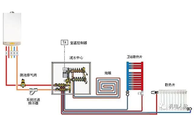 地暖的热源起到加热热水的作用。常见热源包括空气源热泵、燃气壁挂炉、电壁挂炉、市政供暖锅炉等。控制系统是对地暖采暖功能起到控制作用的系统,主要由分集水器和温控器及其他执行器组成。系统的水力分配装置,是地暖盘管与主管之间的管路集中。冷热水混合的动力装置,可提升系统水流速度、缩小供回水温差、是系统高效节能。将高温进水与低温回水混合恒定温度(40-50℃)作为地暖系统的进水。包括地暖盘管和保温层,起到流通热水、传递热量及防止热量流失的作用。电地暖系统通常只由末端与控制器构成,且包含发热电缆、电热膜、碳晶体、碳纤维、石墨烯等多种产品。