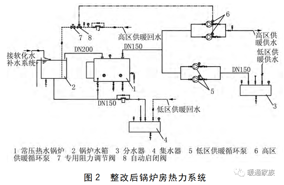 考虑锅炉房已建成,位置不能变动,供暖系统只能按现有情况分高区、低区运行。但是如果还选用组供暖循环泵,则循环泵扬程无法确定:若扬程满足高区需要,则低区散热设备超压;如果扬程只满足低区需要,则高区循环不起来。为使高、低区系统在运行时不相互影响,整改时将原设计的单点定压系统改为高、低压分区系统:将原来的1组供暖循环泵改为2组,1组供高区,1组供低区。高区供暖循环泵出水管不再接入分水器,而是单独接管,供暖回水也不汇至集水器,而是直接接至锅炉水箱内;低区供回水管道利用原有分、集水器及管网。通过整改,将高区和低区的供暖系统完全分开,只是共用锅炉水箱作为定压设备,热力系统见图2。 式中 G 为 水泵的计算流量,m3/h;K1 为 热损失系数,取1.05;Q 为 供暖热负荷,kW;tg 为 设计供水温度,℃;th 为设计回水温度,℃。