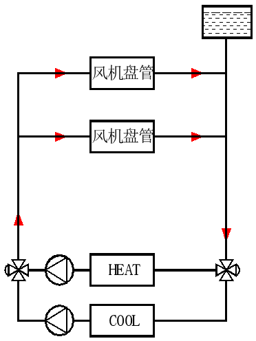 定义:分别设置供冷管路、供热管路、换热设备管路三根水管;其冷水与热水的回水管共用。