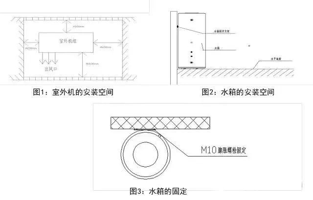 •能提供足够的安装和维护空间处; •进出风口无障碍和强风不可吹到处; •干燥通风处; •支承面平坦,能承受室外机重量,可以水平安装室外机,且不会增加噪音及振动处; •运行噪音及排出空气不影响邻居处; •无可燃气体泄漏处; •便于安装水路进出水管和电器连接处; •推荐场所:阳台,室外空调栏,屋顶等。 注意:安装在下列场所可能会导致机器故障(如不可避免,请咨询) •有如机油等矿物油的地方 •电源电压波动严重的工厂等地方 •汽车或舱室内等地 •厨房等充满油气和油花的地方 •存在易燃气体或材料的地方 •存在酸性或碱性气体蒸发的地方 •其他特殊环境条件处 家用水箱安装场所选择