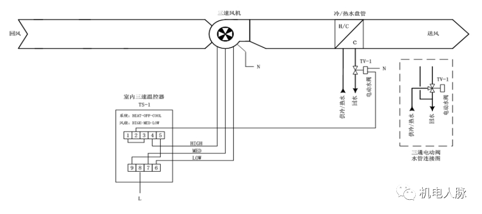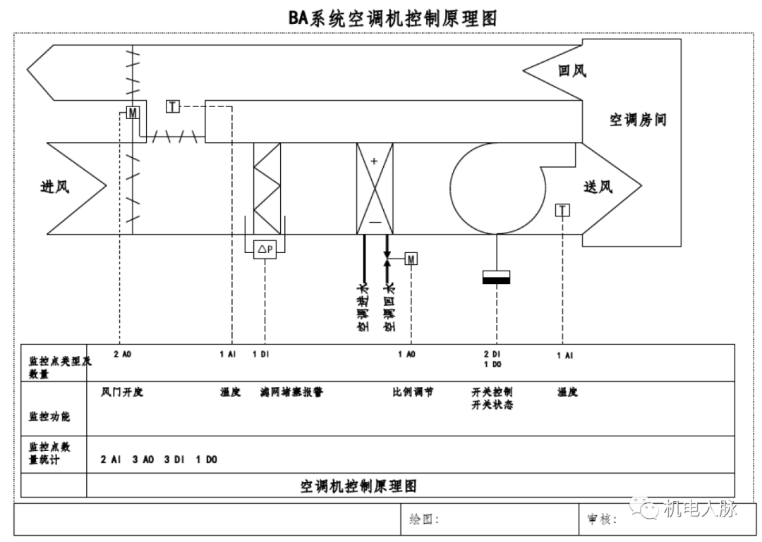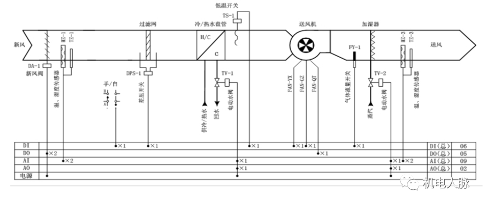 温度控制:根据送风温度采样值和程序设定值比较,通过PID计算输出控制冷、热水阀的开度。湿度控制:根据送风湿度调节加湿阀流量开度,控制蒸汽送给量以此来改善房间的湿度。联锁控制:风机状态和冷、热水电动阀、加湿阀、新风风阀、实施联动。参数监测:送新风温度、送新风湿度、室外温度、手动/自动转换、风机运行状态、过滤网压差开关、风机压差开关、防霜冻保护开关。报警功能:过滤网两端的压差超限(过滤网堵塞)报警,风机故障报警,防霜冻低温报警,参数越限报警等。末端风机盘管用来调整房间的温度。它通常直接由室内恒温器控制。