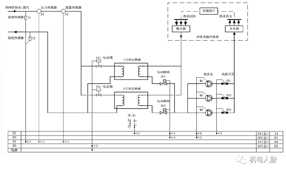 将热交换器二次热水出口的检测温度送入DDC与设定值比较,控制热交换器上的一次热水/蒸汽电动调节阀,改变一次热源供给的流量,使二次側热水出口的温度得到调节。DDC完成对冷冻泵的启停控制、运行状态、故障报警信号的管理。自动实现恒压控制、循环倒泵、备用替开等功能。根据负荷启动热交换器工作参数。热水泵停止运行时,自动关闭热交换器一次側的热水/蒸汽电动调节阀。热交换器一次側供给热水(蒸汽)的温度、压力、流量,二次测供水温度、压力等。
