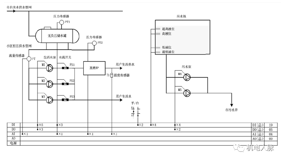 给排水是由生活供水(冷水、热水)和污水排放等环节组成。在供水方面主要是实施恒压供水,污水池液位的指示和报警,以及各种供水、排水泵的定时循环工作。恒压供水技术通常是由变频器、软启动器等组成的电气控制系统。污水主要根据积水坑的高、低液位浮球信号来控制排污泵的启动和停止。