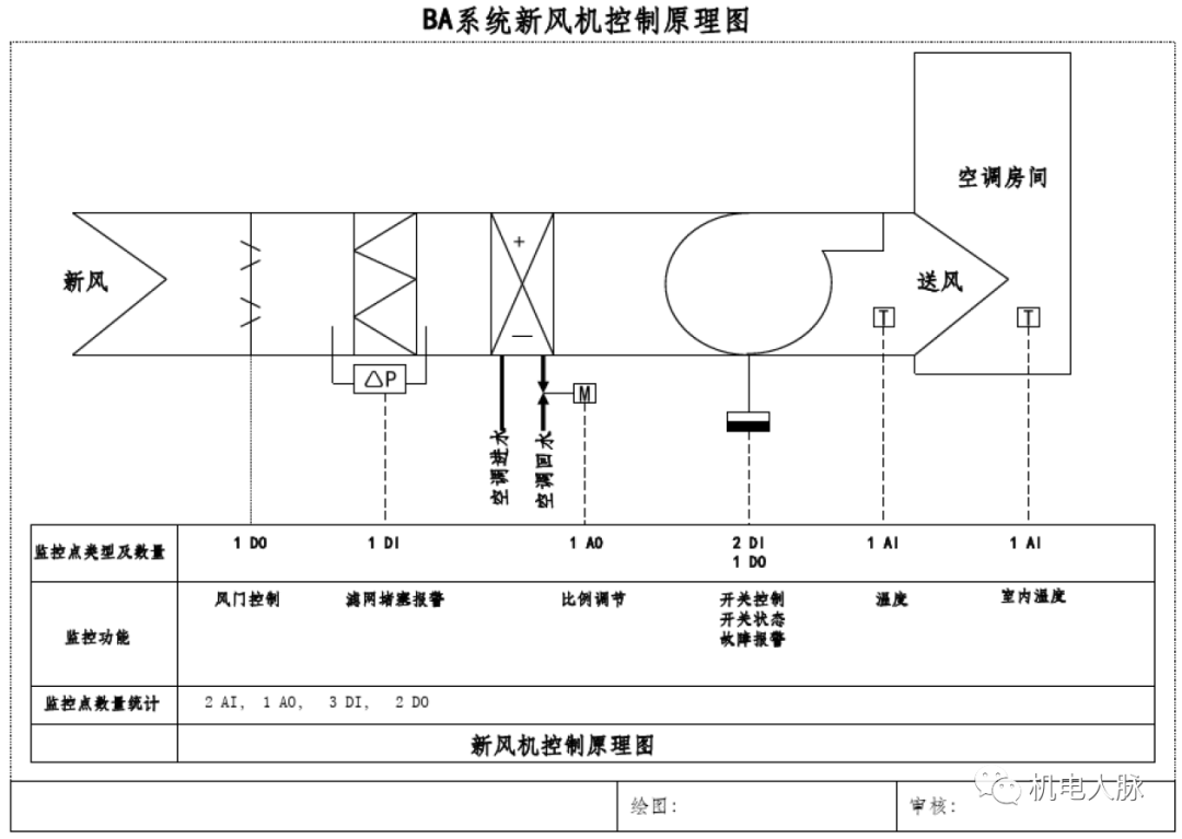温度控制:根据回风温度采样值和程序设定值比较,通过PID计算输出控制冷、热水阀的开度。湿度控制:根据回风湿度调节加湿阀流量开度,控制蒸汽送给量。风阀控制:根据室外温度和回风CO2浓度,调整风阀开度。联锁控制:风机状态和冷/热水电动阀、加湿阀、新风风阀、回风风阀实施联动。参数监测:送风温度、湿度,回风温度、湿度,室内温度,室外温度,手动/自动转换,风机运行状态,电动水阀阀位反馈,加湿阀阀位反馈,过滤网压差开关,风机压差开关,防霜冻保护开关,室内空气质量(CO2)等。报警功能:过滤网压差超限(过滤网堵塞)报警、风机故障报警、防霜冻低温报警、参数越限报警等。新风机组主要是用来给大楼内提供新风。它对房间的温度并不实施控制,新风机是采用定时送风的方式(属于开环控制),通常和末端风机盘管组合来完成大楼的空调控制。