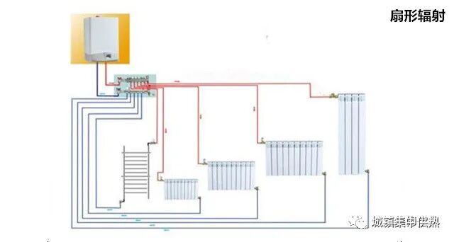 扇形辐射法的特点是装有分水器,往各组散热器都是单独的供回水管,实现了像地暖一样集中独立控制,调节温度方便,散热器入口处的管道可以暗埋。但他安装时由于每组散热器都要单独回路,管道使用量较大,安装成本较高,目前大多数客户还接受不了。