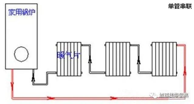 这种方法是最经济和古老的走法,有节省管道降低成本的优点。但由于单管室内采暖系统不能单独调节每个散热器的流量,所有水路都要通过前边的散热器,一旦前边的出现问题就影响了后边的使用,所以不是非常推荐这种连接方法。