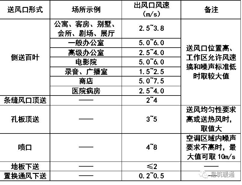 1 一般房间宜采用百叶风口或条缝型风口从单侧或双侧送风,射流宜贴附;2 房间的上部空间有条件时,宜采用贴附射流的散流器送风;层高较高时,可采用直片式散流器送风;3 会堂、体育馆、影剧院等高大空间,宜采用喷口或旋流风口送风;4 区域温差和人员活动区风速要求严格、单位面积风量较大、室温允许波动范 围较小的空调房间,宜采用孔板下送风方式;5 演播室等室内余热量大的高大空间,宜采用可伸缩的圆筒形风口下送风方式;6 高度 ≥10m且体积>10000m3的高大建筑空间,如上部无温度要求,宜采用分层空调;送风宜采用侧送,回风口在同侧下部。5.4.4 采用贴附侧送风方式时,应符合下列要求:1 送风口上缘离吊顶距离较大时,送风口应设置向上倾斜10°~⒛°的导流片;5.4.5 采用散流器贴附顶送风方式时,应符合下列要求:1 应根据空调房间吊顶高度,允许噪声值等确定散流器允许的最大喉部送风速度,以及散流器 的型式和数量;2 吊顶上部应有安装风管和散流器风量调节阀的足够高度 ;3 布置散流器的平面位置时,应有利于送风气流对周围空气的诱导,避免产生死角,射流途中不得有阻挡物。5.4.6 采用孔板下送风方式时,应符合下列要求:1 孔板上部稳压层的高度应经计算确定:且净高不应小于0.2m;2 向稳压层内送风的速度宜采用 3~5m/s;当送风射程小于4m时,稳压层内可不设送风分布支管;在进风口处宜装设防止送风气流直接吹向孔板的导流片或挡板;4 利用吊顶上部空间做静压箱,在吊顶上直接设孔板或风口时,吊顶四周及顶部围护结构应保温和密封,且不应大面积采用这种送风方式。1 喷口送风的射程和速度、喷口直径及数量、喷口的安装高度,应根据空调区高度和回流区的分布位置等因素通过计算确定;3 兼作热风采暖时,应具有改变射流出口角度的可能性 。5.4.8 分层空调的气流组织设计,应符合下列要求:1 空调区宜采用喷口侧送,侧送喷口高度宜距地4~5m;当空调区跨度大于25m时 ,宜采用双侧送风,回风口宜布置在送风口的同侧下方;2 侧送多股平行射流应互相搭接;当采用双侧喷口对送时,其射程可按两侧喷 口中点距离的90%计算 ;3 应尽量减少非空调区向空调区的热转移,必要时,可在非空调区设置送、排风装置。例如公共建筑的中庭等高大空间应能利用自然通风排除上部高温空气,必要时设置机械排风装置 。1 在高大空间中人员不长期停留的区域,例如文体建筑的高大休息厅廊等,可 采用地板下送风方式;2 有大面积玻璃外墙的冬、夏使用的游泳馆,宜采用沿外墙地面或窗台向上送风的方式;3 人员长期停留的区域在满足下列条件时,可采用置换通风方式:1)热源以人员、设备(计算机、复印机等 )、 灯光为主,且人员密度变化不大,人 员活动量较轻,显热负荷不宜超过 120W/㎡;注:置换通风为下部送风的一种特例,其机理是送入的冷空气层依靠热浮升力的作用上升带走热湿负荷和污染物,而非依靠风速产生送风射程,因此只适用于 全年送冷的区域;当送人热风或送风速度较大时,便不再属于置换通风范畴,为一般下部送风。