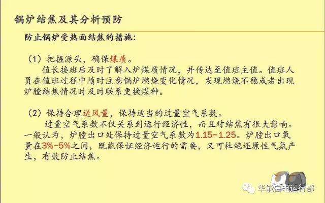 3、合理配风,保持适当的过空气系数。过空气系数不仅关系到运行经济性,而且对结焦有很大影响。一般认为,炉膛出口处保持过空气系数为1.15~1.25。炉膛出口氧量在3%~5%之间,既能保证经济运行的需要,又可杜绝还原性气氛产生,有效防止结焦。