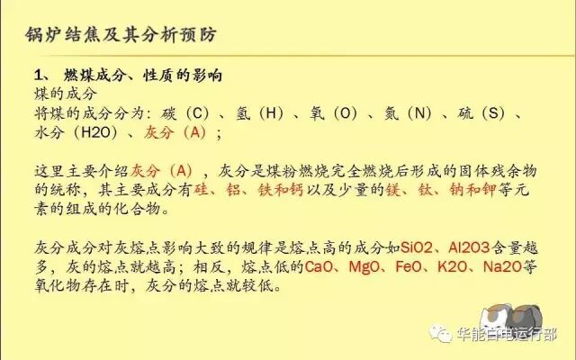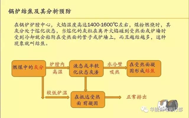煤燃烧后形成煤灰。煤灰的性质主要是指它的熔化性和烧结性,熔化性主要影响炉内的运行工况,烧结性主要影响对流受热面的结灰性能。在火焰中心,灰分处于熔化状态或软化状态,具有粘性,如果遇到受热面管子,很容易粘接在上面,形成结渣。