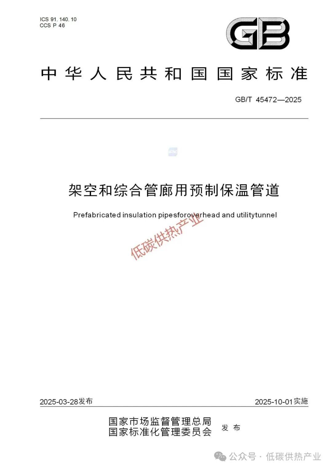 10 月 1 日实施!新国标《架空与综合管廊用预制保温管道》