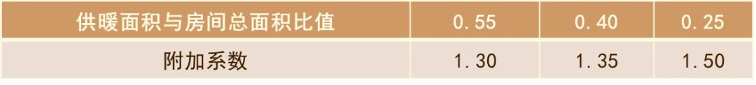 6、局部地面辐射供暖系统热负荷,可按整个房间全面辐射供暖所算得的热负荷乘以该区域面积与所在房间面积的比值和下表中所规定附加系数确定。