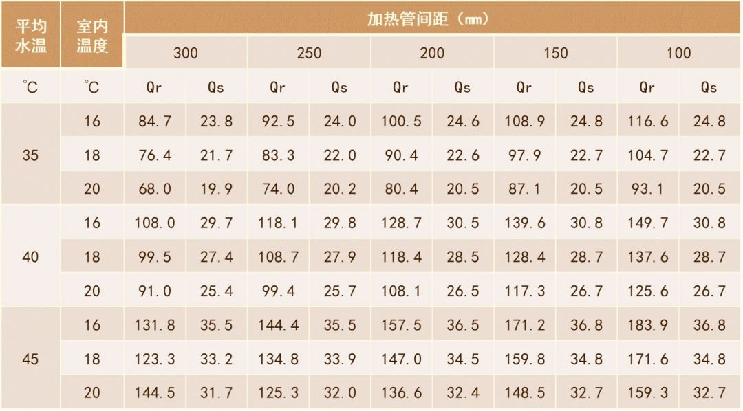管外径为20mm、填充层厚度为50mm、聚苯乙烯泡沫塑料绝热层厚度20mm、供回水温差10℃(水泥或陶瓷地面,热阻R=0.02(㎡.k/w))