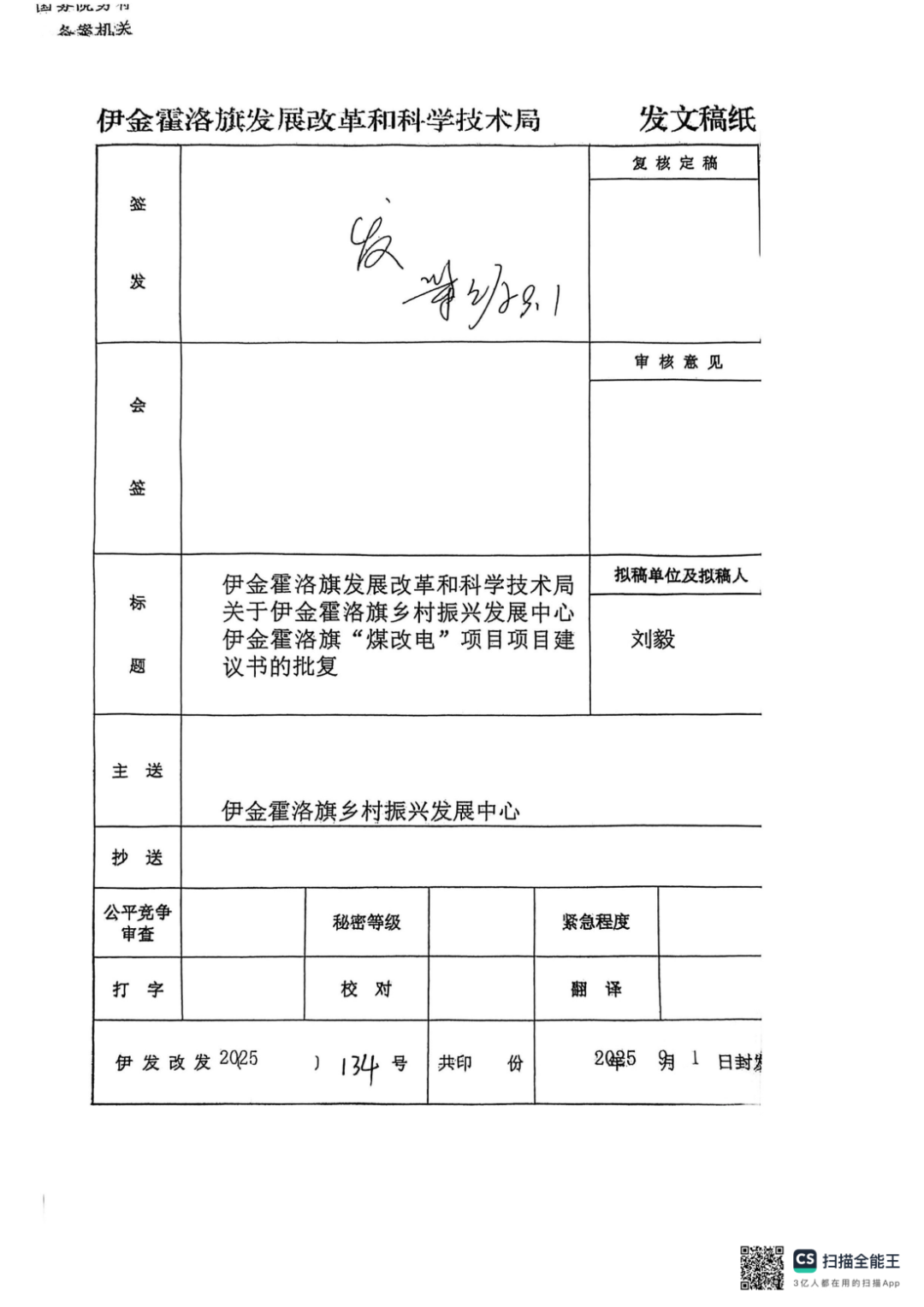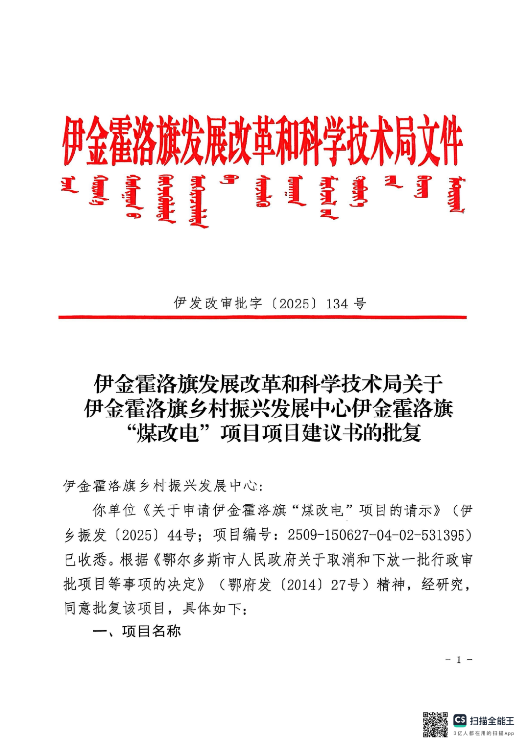伊金霍洛旗发展改革和科学技术局关于伊金霍洛旗乡村振兴发展中心伊金霍洛旗“煤改电”项目项目建议书的批复