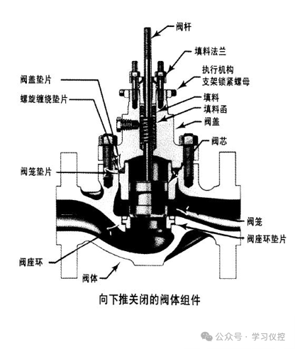 如下图所示,调节机构是由阀盖、阀体、阀座、阀芯、阀杆和填料等零部件组成。阀杆和阀芯连接在一起,阀芯是阀内最为关键的零件,为了适应不同的需要,得到不同的阀门特性,阀芯的结构形状是多种多样的。