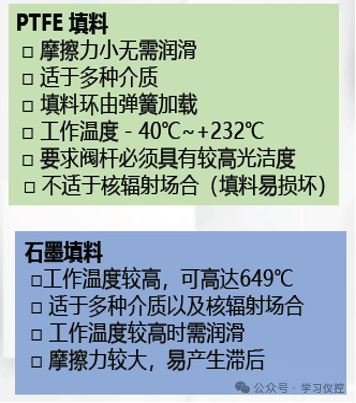 石墨填料的摩擦力较大,聚四氟乙烯则相对较小。但是石墨却具有更强的耐磨性,使用寿命长。故聚四氟乙烯对阀杆光滑度的要求更高。
