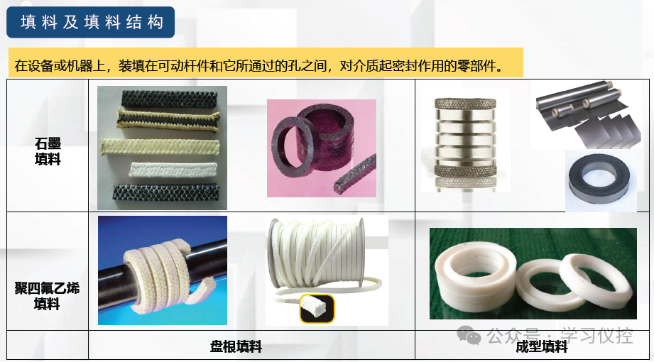 聚四氟乙烯填料:聚四氟乙烯填料有2种,一种是用聚四氟乙烯分散树脂做成的,另一种是用聚四氟乙烯悬浮树脂割裂纤维为主体材料做成的,前者较软,后者硬,两种耐腐蚀性能相同,使用温度-40~200摄氏度,颜色为白色。