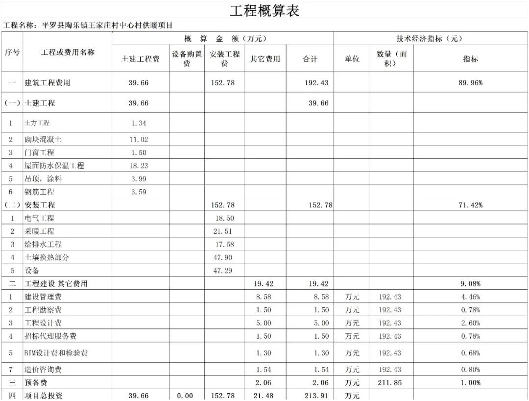 项目概算总投资213.91万元,其中:工程费用192.44万元,其他费用20.41万元,预备费用1.06万元。